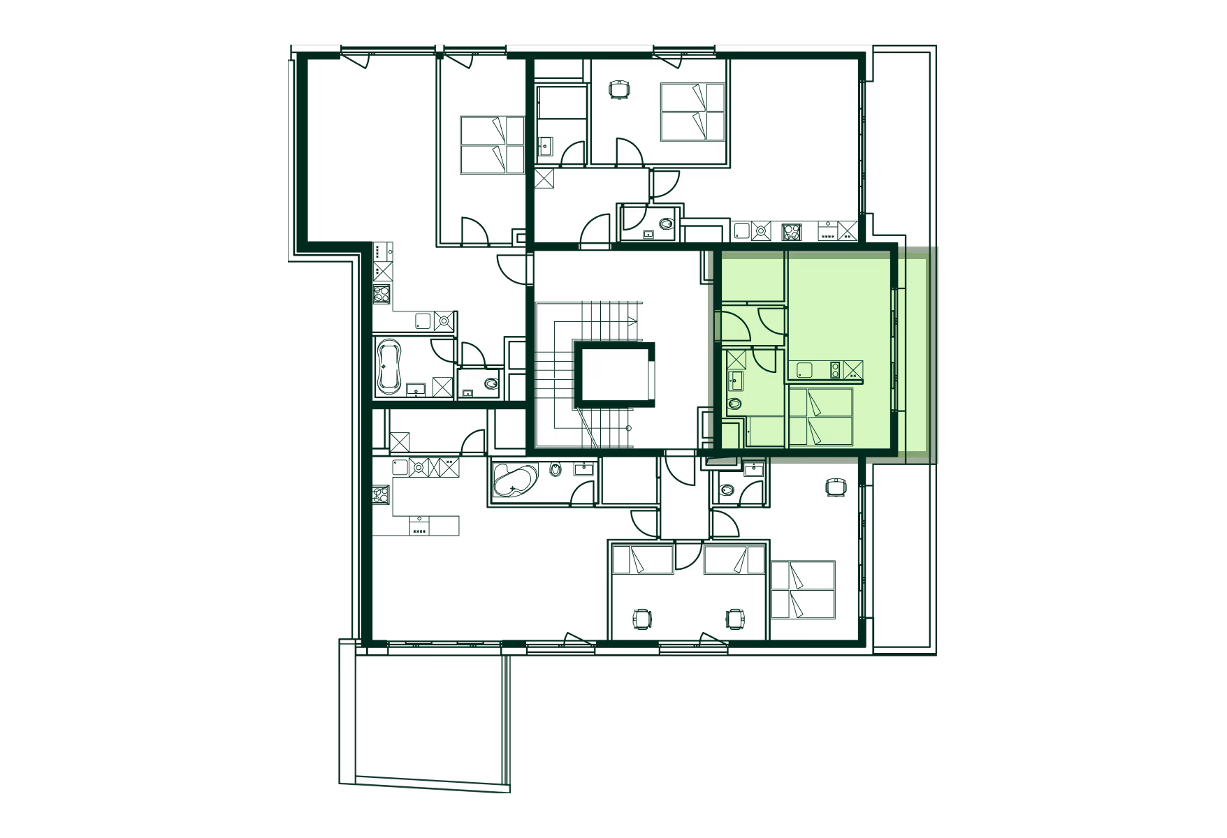 Plochy jednotlivých místností jsou pouze orientační. Vyobrazené zařízení v půdorysu (nábytek, kuchyňská linka, elektrické spotřebiče, atd.) není součástí dodávky. Rozsah dodávky, specifikace konstrukcí, povrchové úpravy a vybavení jsou specifikovány ve standardním provedení, které je přílohou Smlouvy o budoucí kupní smlouvě. Vizualizace mají pouze ilustrativní charakter. Developer si tímto vyhrazuje právo na případné změny, úpravy či doplnění tohoto prodejního listu.