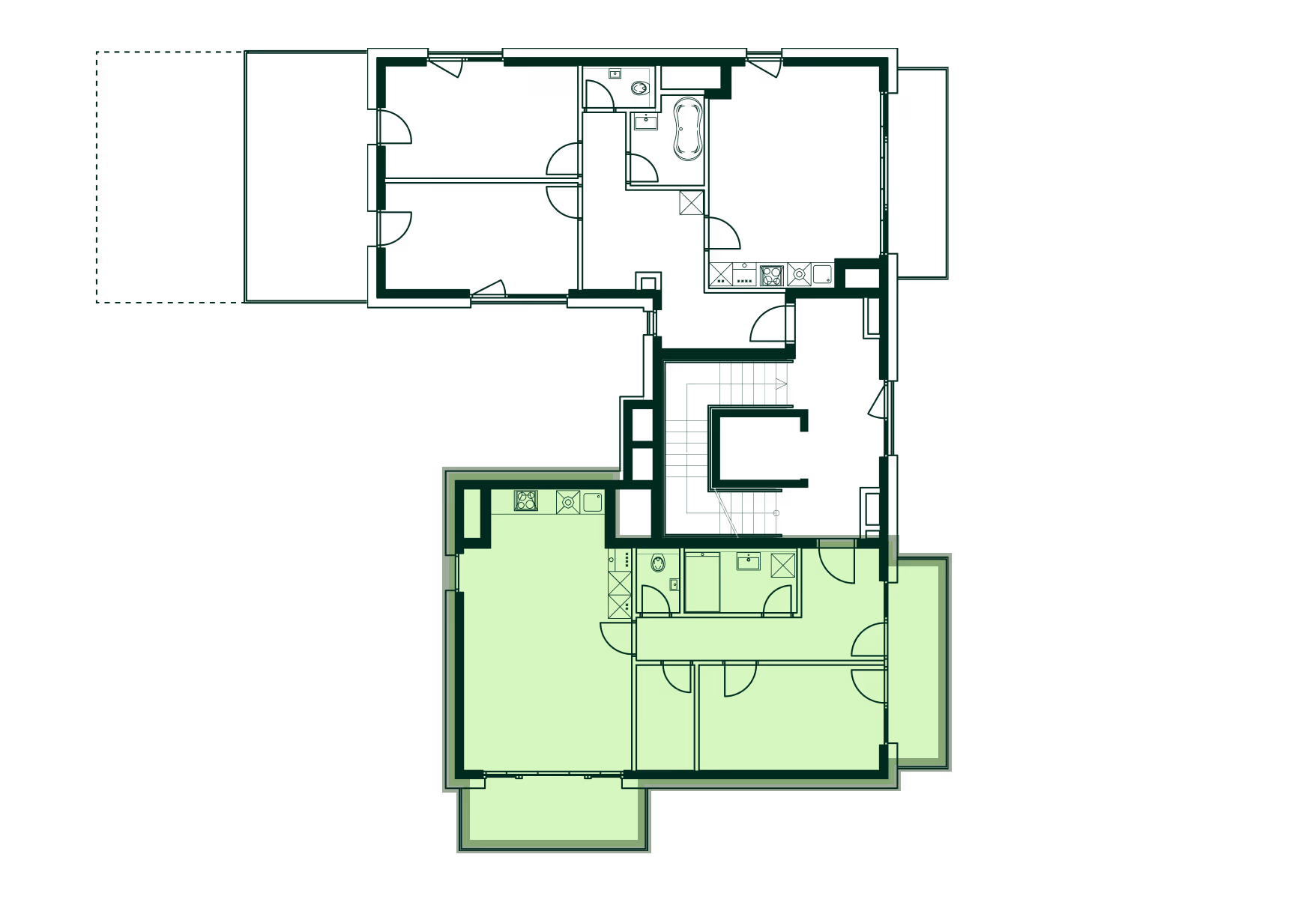 Plochy jednotlivých místností jsou pouze orientační. Vyobrazené zařízení v půdorysu (nábytek, kuchyňská linka, elektrické spotřebiče, atd.) není součástí dodávky. Rozsah dodávky, specifikace konstrukcí, povrchové úpravy a vybavení jsou specifikovány ve standardním provedení, které je přílohou Smlouvy o budoucí kupní smlouvě. Vizualizace mají pouze ilustrativní charakter. Developer si tímto vyhrazuje právo na případné změny, úpravy či doplnění tohoto prodejního listu.